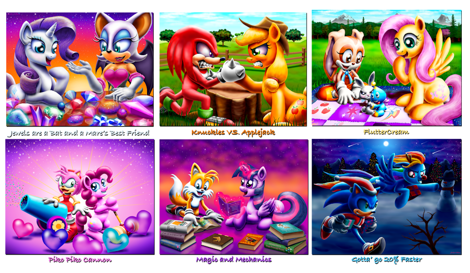 Over 2 years ago, I uploaded a drawing featuring Rarity and Rouge the Bat bonding over their love for jewelry. Someone suggested that I should turn this into a series featuring other characters from both franchises. I figured this would be a good idea since both Sonic and MLP have massive overlapping online fanbases and so I ended up doing the entire Mane Six based on their matching personalities; Rarity/Rouge, Knuckles/Applejack, Fluttershy/Cream, Pinkie Pie/Amy Rose, Twilight/Tails, and Rainbow Dash/Sonic. I still have other ideas for MLP/Sonic pairing for 2026 including Vinyl Scratch/Vector, Octavia/Espio, and possibly Derpy/Big. Do you have any other ideas for pairings? Please let me know in the comments.