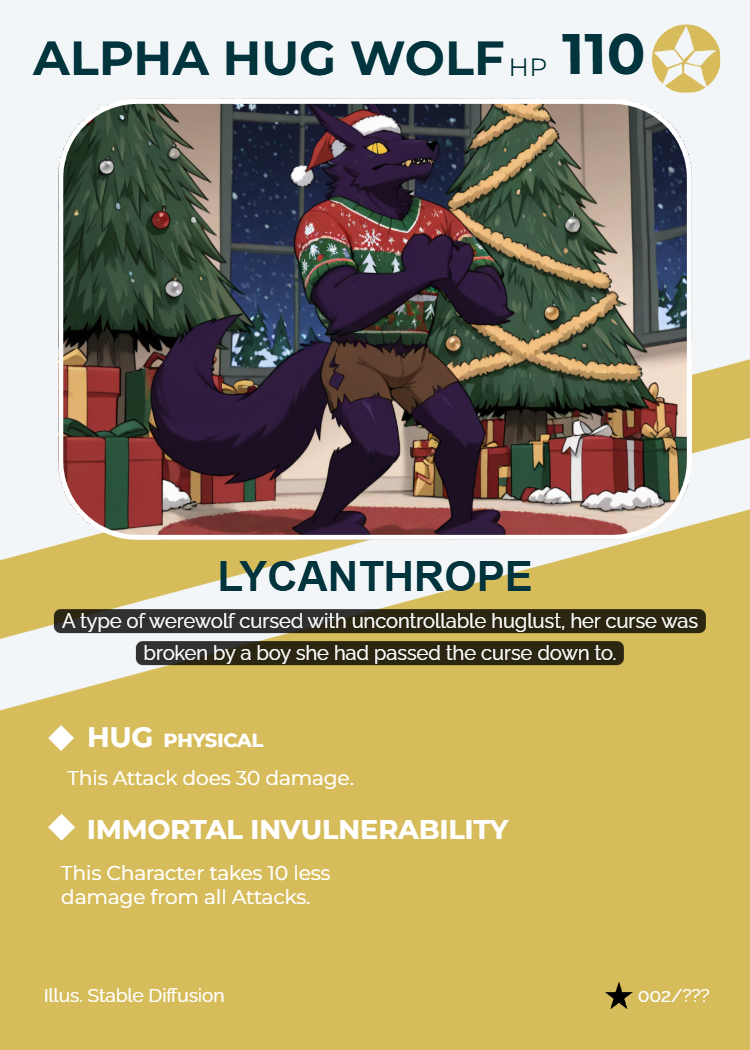 masterpiece, best quality, amazing quality, Christmas theme, Christmas tree, Christmas present, Christmas sweater, santa hat, standing, ((solo)), <lora:Alpha_Hug_Wolf__Adventure_Time:1>, ahw-at, purple fur, black nose, yellow sclera, green slit pupils, heart-shaped hands, heart-shaped feet, tail, torn brown shorts