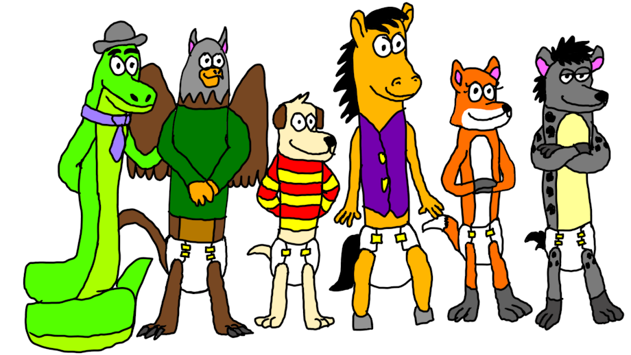Feathers is a teenage gryphon. He had hatched from his egg in a mountain Slither was hiking, and Slither had raised him like a son, always there for him whenever he's in trouble or in need of help. There were times he felt discouraged for wearing diapers he needed for his incontinence, but the support he had from his guardian and friends, and eventually his adoptive siblings, helped him understand he was never alone.