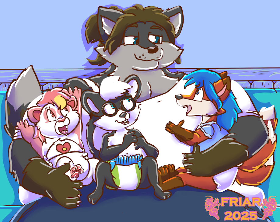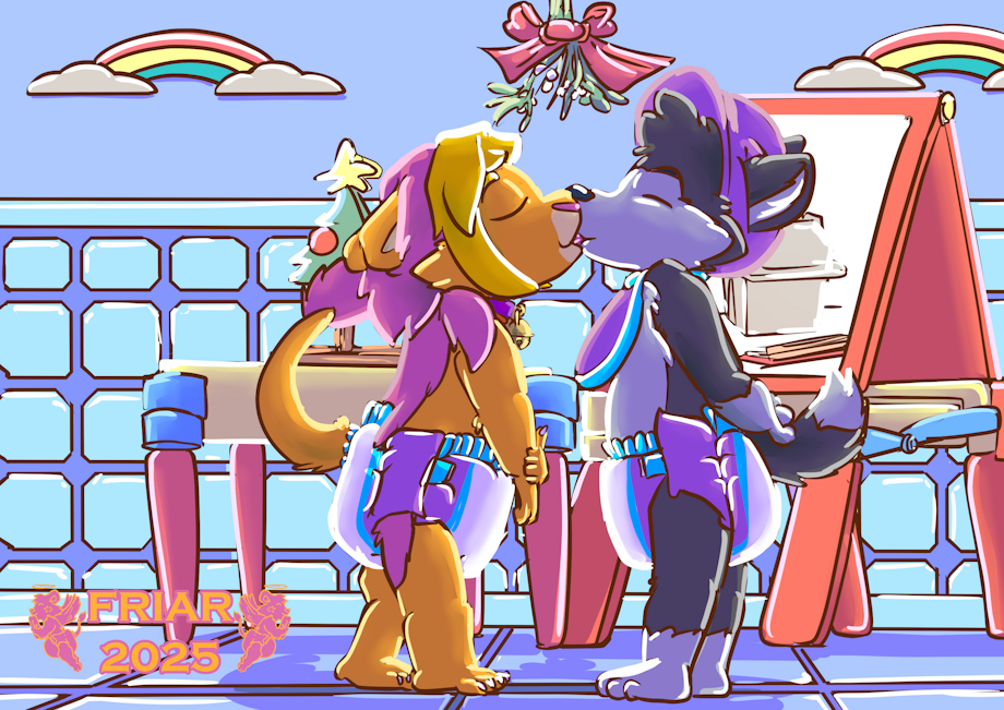 Illustrated commission of Friar the wet and messy diapered lion kissing Crunch the wet and messy diapered poochyena under the mistletoe in the nursery. Both are pooping their diapers. A drawing of a take out box is on an easel and a small christmas tree is on a table behind Friar.