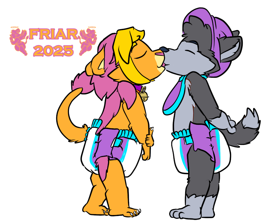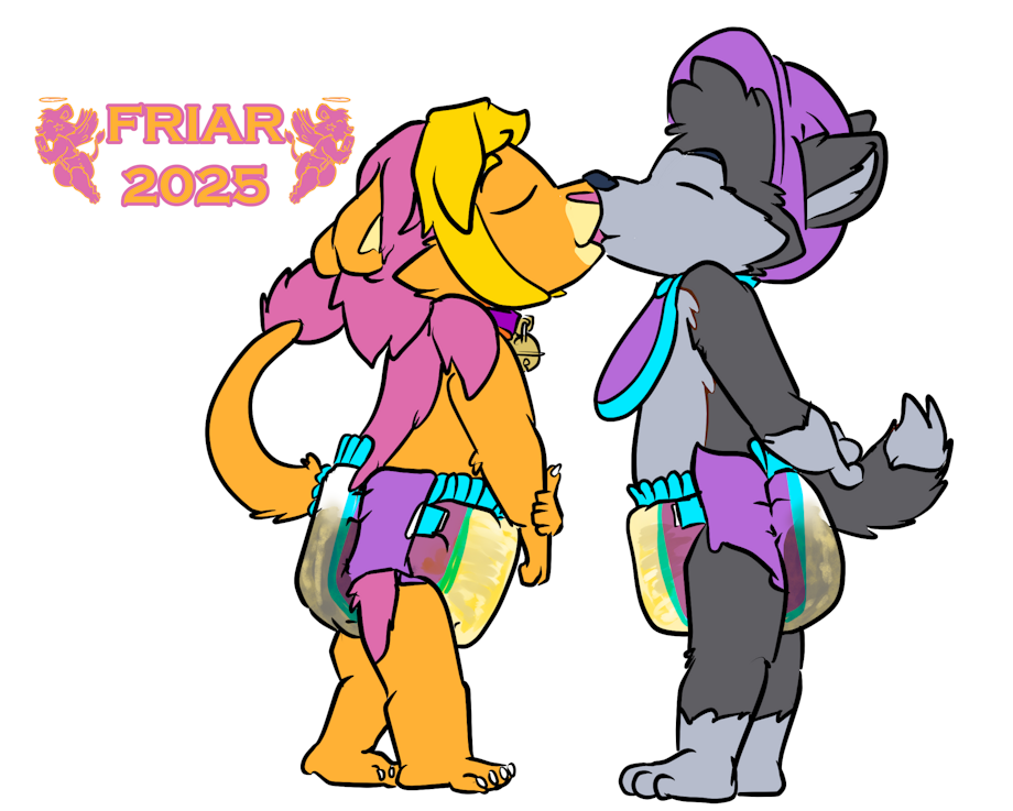 Illustrated commission of Friar the wet and messy diapered lion kissing Crunch the wet and messy diapered poochyena under the mistletoe in the nursery. Both are pooping their diapers. A drawing of a take out box is on an easel and a small christmas tree is on a table behind Friar.
