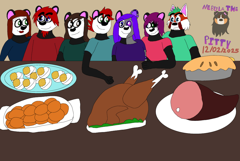 A very late Thanksgiving 2025 drawing of Angel and her family. There was originally going to be an animation special for this, but I putting this on hold until next year due to lack of time to work on it and finishing people’s requests.
