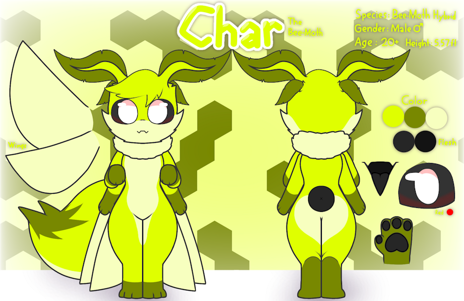 He is a pink axolotl with six gills on the sides of his head, hair on his forehead, two crests on his head. His lower face is white, extending to his groin and tail, and his hands and feet are white. He has blue flesh, blue paws and feet, black eyes with white pupils, two small fangs. He has a large, long tail and a large long fin extending from his back.