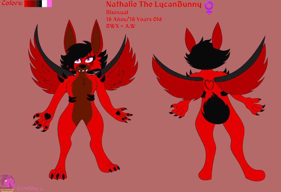 ----- - She is a character who belongs to two Mangled universes. Nathalie the Lycanbunny is a mix between a rabbit and a wolf and she is a light vampire despite her dark red color and indigo hair. Previously Nathalie had a huge mane of hair and of course a half ear, but Dellia Dalmatian took it upon herself to completely fix the bunny's body and make several changes, even adapting the color of her ears to the color of the bunny's fur. The only thing that Dellia was unable to fix on Nathalie's body were the spikes embedded in the bunny's arms because these spikes became part of the red bunny's skeleton.
