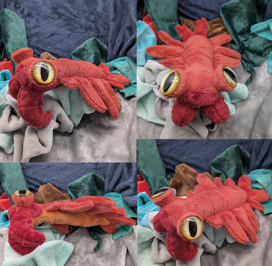I keep making these, tweaking the pattern a little each time, though you probably can't really tell. This one is based on Wikipedia's scientific illustration of Anomalocaris canadansis. It's another one I've kept, and is sitting next to me right now. <3