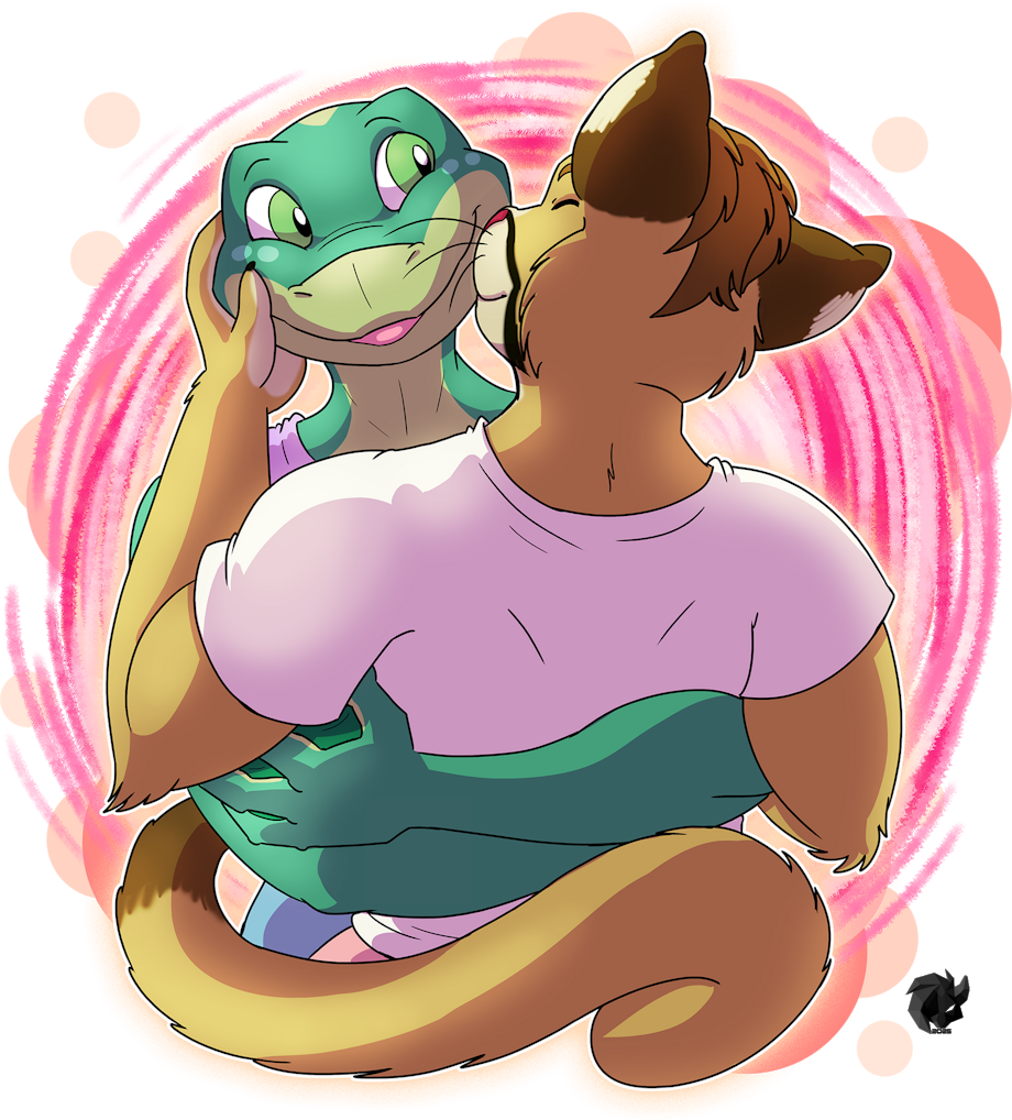 And with the yer coming to a close just adding in sweetness and candy colour With my vacation still going strong and the year coming to a close I've got a comm that is sweet and affectionate and candy coloured ready for today in fact make it a double! This sweet little piece was done by the ever amazing Valyce Negative! (furaffinity.net/user/valery91thunder) She really knows how to make the sweetest of images and she again shined bright with making Spence and Cole so cute and affectionate! I adore how it came out and the colour choices for the BG swirls and bubbles was her amazing idea! I can't thank her enough for this set, seriously go check out her gallery and socials for great art! Plus I really need to draw / get more couples images both of mine and ones Danji and I share ~.=.^