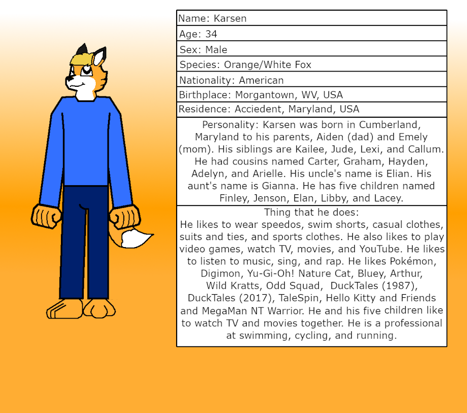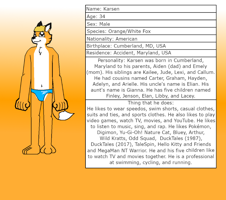 Karsen is a 34-year-old orange/yellow Fox from the U.S. state of Maryland. He was born in Morgantown, West Virginia to his parents, Aiden and Emely, and lives in Accident, Maryland. Karsen has a wife named Jodie. He has two brothers and two sisters. His brothers are Jude and Callum. He has two sisters named Kailee and Lexi. He has five children. His three sons are named Finley, Jenson, and Elan. His two daughters are named Libby and Lacey. He has cousins named Carter, Graham, Hayden, Adelyn, and Arielle. He likes to wear speedos, swim shorts, casual clothes, suits and ties, and sports clothes. He also likes to play video games, watch TV, movies, and YouTube. He listens to music (including Rock, Pop, J-Rock, J-Pop, K-Rock, K-Pop, Hip-Hop, Rap, R&B, Electronic, House, Trance, EDM, and Jazz), He likes Pokémon, Digimon, Yu-Gi-Oh!, Nature Cat, , Bluey, Arthur, Wild Kratts, Odd Squad, DuckTales (1987), DuckTales (2017), TaleSpin, Hello Kitty and Friends, and Mega Man NT Warrior. He and hsi five children can watch TV and movies together. He is a professional at swimming, cycling, and running.