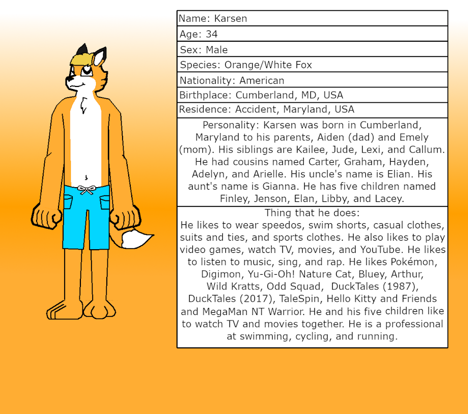 Karsen is a 34-year-old orange/yellow Fox from the U.S. state of Maryland. He was born in Morgantown, West Virginia to his parents, Aiden and Emely, and lives in Accident, Maryland. Karsen has a wife named Jodie. He has two brothers and two sisters. His brothers are Jude and Callum. He has two sisters named Kailee and Lexi. He has five children. His three sons are named Finley, Jenson, and Elan. His two daughters are named Libby and Lacey. He has cousins named Carter, Graham, Hayden, Adelyn, and Arielle. He likes to wear speedos, swim shorts, casual clothes, suits and ties, and sports clothes. He also likes to play video games, watch TV, movies, and YouTube. He listens to music (including Rock, Pop, J-Rock, J-Pop, K-Rock, K-Pop, Hip-Hop, Rap, R&B, Electronic, House, Trance, EDM, and Jazz), He likes Pokémon, Digimon, Yu-Gi-Oh!, Nature Cat, , Bluey, Arthur, Wild Kratts, Odd Squad, DuckTales (1987), DuckTales (2017), TaleSpin, Hello Kitty and Friends, and Mega Man NT Warrior. He and hsi five children can watch TV and movies together. He is a professional at swimming, cycling, and running.