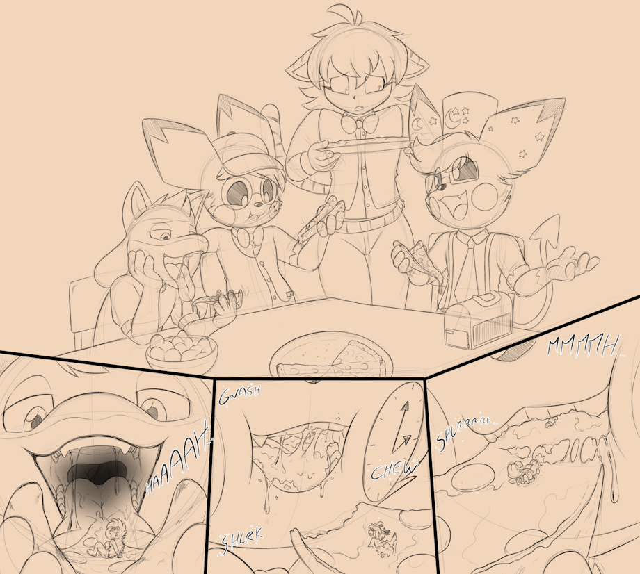part of an old art slave sesh for Gibblet. Featuring Aiden, Jaiden and their Riolu friend enjoying some casual pizza time with special micro toppings. the Pichus' butler seems nervous, not sure why uwu