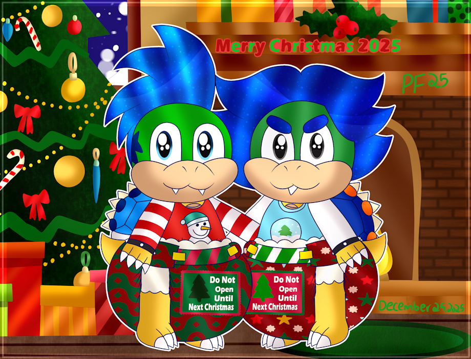 Anyway, here is a drawing of Larry and Ludwig. Celebrating a koopaling Christmas. With pamps on. I did a really good job making the pamps designs. Anyhow, in this drawing. Larry and Ludwig is hanging out together with just them two. While the others is outside and playing in the snow. So, Bowser took a picture of Larry and Ludwig. in Christmas sweaters and Christmas pamps. Bowser will and always let his kids have a good Christmas. In my AU, Larry and Ludwig is very attached to one another.
