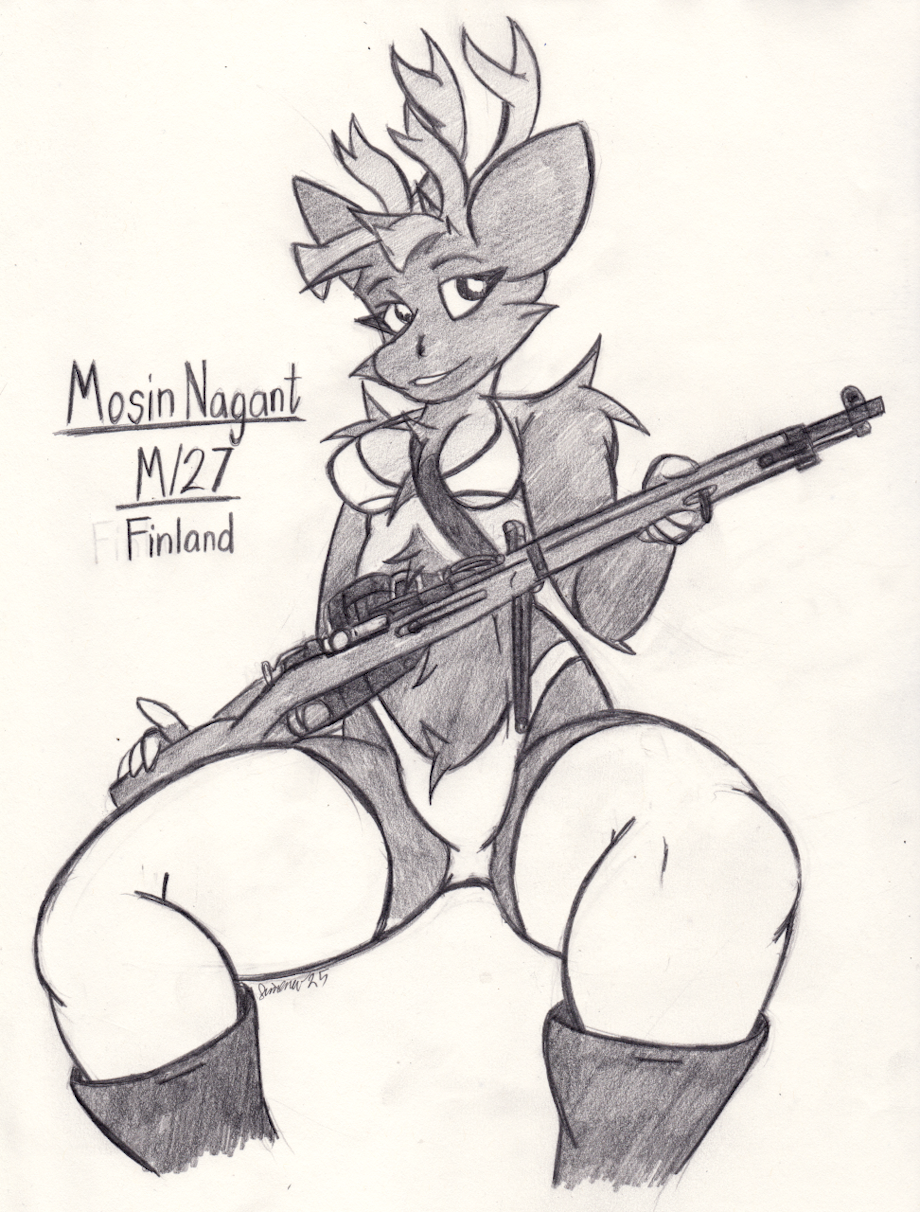 Finland making its appearance with a pretty reindeer lass armed with the Mosin Nagant M/27 rifle.
