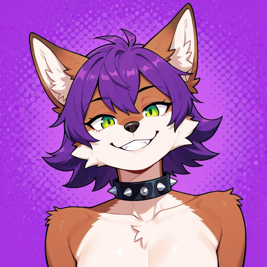 Generator: CivitAI Model: Banana Splitz XL - Vee 8 Point Oh! - 0584FAF49B2D Prompt: Wolf, femboy, purple hair, brown fur, white chest, green eyes, black spiked collar, smiling, directly looking at viewer, purple background Negative prompt: human, zombie, ugly, horror, glitch, artifacts, extra tail, pubic hair, 3d, cropped, (simple background:1.0), siblings, bad legs, clones, clones, sketch, rought lines, watermark, signatures, artist name, Steps: 30, baseModel: Illustrious, CFG scale: 7, Sampler: DPM++ 2M Karras, Seed: 1998116657, workflow: txt2img, Size: 1024x1024, draft: false, width: 1024, height: 1024, quantity: 1, disablePoi: true, aspectRatio: 1:1, Created Date: 2025-12-29T2021:13.6905366Z, Clip skip: 2 |
