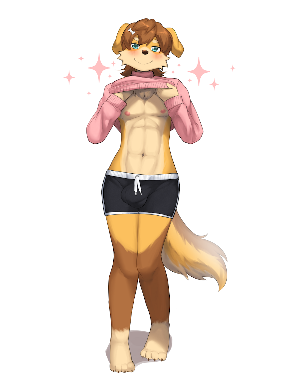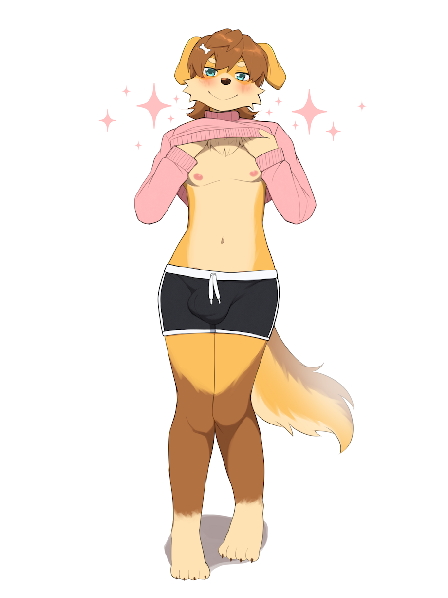 Waffle: hi. I'm glad my body is the model for commission roo310. A little embarrassing because I'm gaining weight... Oh, don't look at my crotch, it's embarrassing!