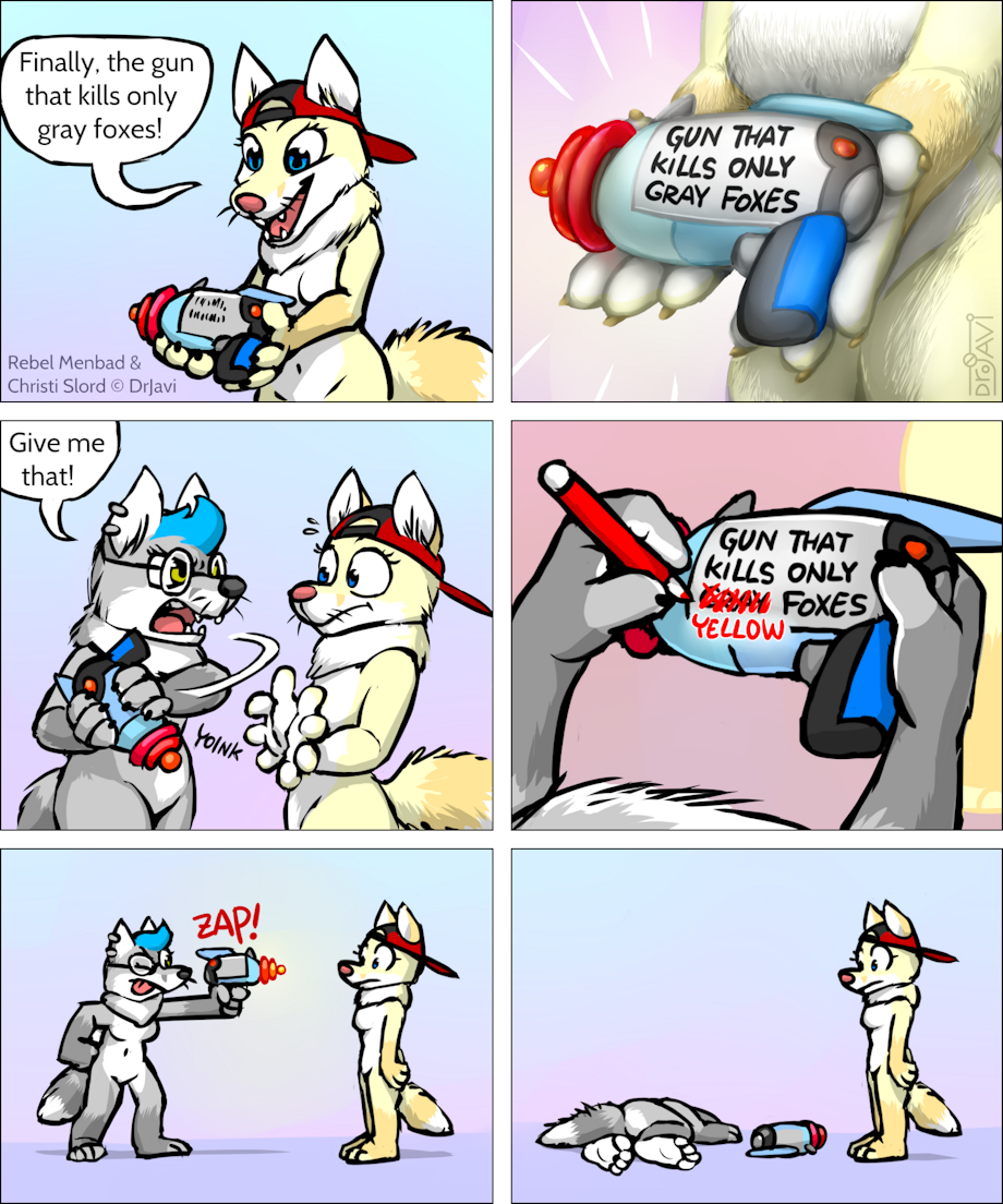 Also the question on why the yellow fox has such a gun... whether the grey fox's response is because of the gun, or is common enough that the yellow fox needed such a gun in the first place. Either way, it's often the outcome if violence is the first choice.
