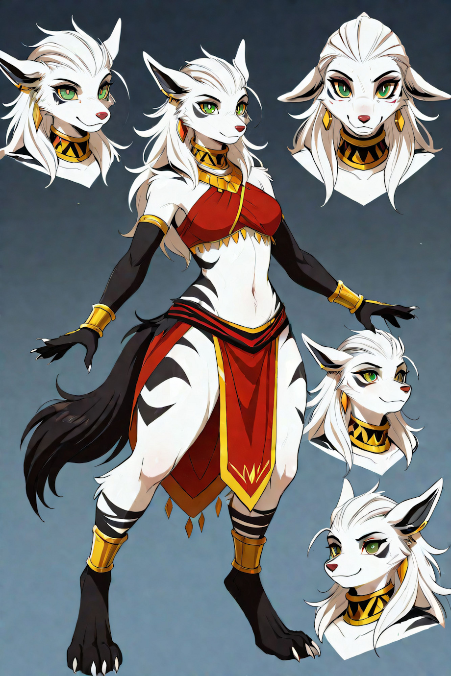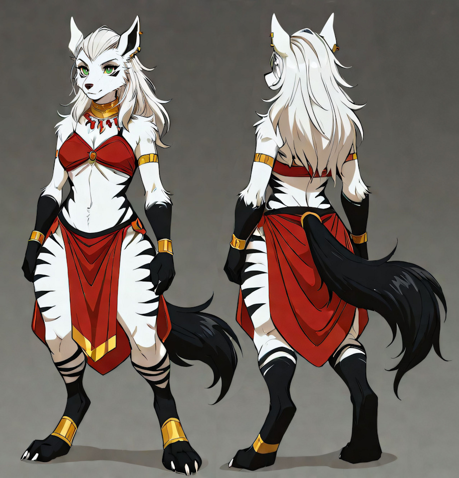 White Fur, Digitigrade Legs, Clawed Fingers, Clawed Hands, Black Fluffy Tail, Pink Nose, Pointed Ears, Slender and Athletic Build, Black Arms, Black Feet, Black markings, and Slim Waist.