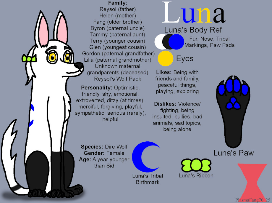 Luna is a young dire wolf who lives with her family and pack. She grew up along her brother being ostracized with her odd fur color. The young wolfess witness her mother practicing her spells and tries to copy her but fails. When Helen notices her daughter, she helps her learn a few basic things about her heritage and mentioned that her brother, Fang couldn't learn much about tribal magic. Overhearing this, Fang reassures Luna that he prefers not learning any magic and suggests that she learns from their mother. Over the years and into her adolescence, she slowly becomes independent on her own and tries to hunt one day, but her power scared off another predator trying to take her food. She returned with news of her newfound abilities but quickly became ill due to it and the mother tends to her daughter’s condition. Soon after recovering, Luna decided to leave her home after hearing her brother left as well promising that she’ll return someday.