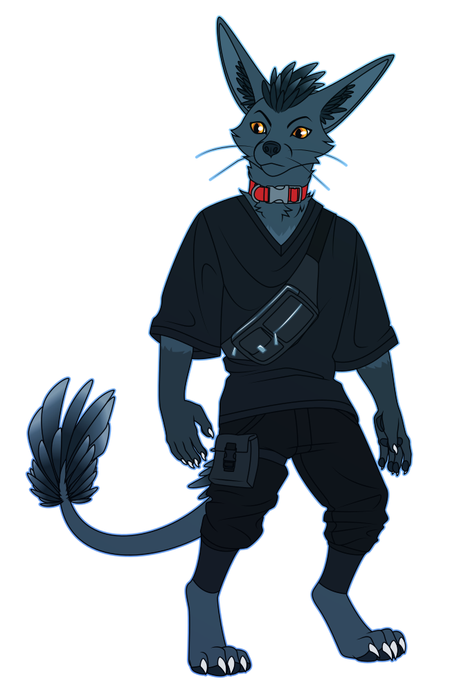 [A flat-colored illustration of an anthro fox with a feathered mane and tail, wearing a red collar and black techwear]