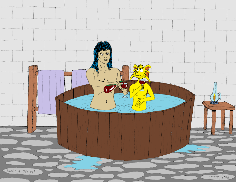 Elena Rosa Capratis and her kobold wizard lover Denvil Ightoughy share a bath and a bottle of wine.