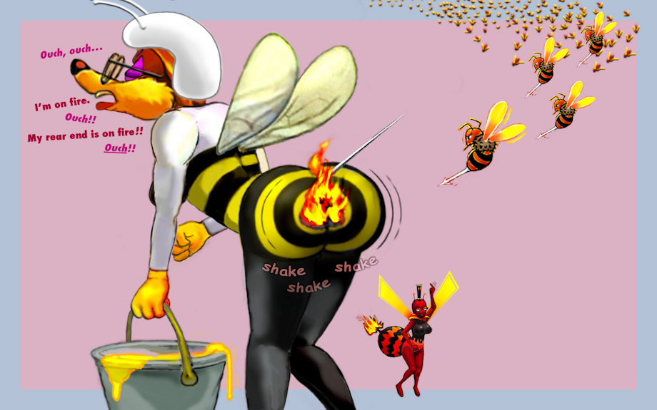 Fire Queen Bee lights a signal fire to guide the avenging swarm to the enemy target. Fire Queen Bee belongs to @French-Bee. Dottie Coyote is moi.