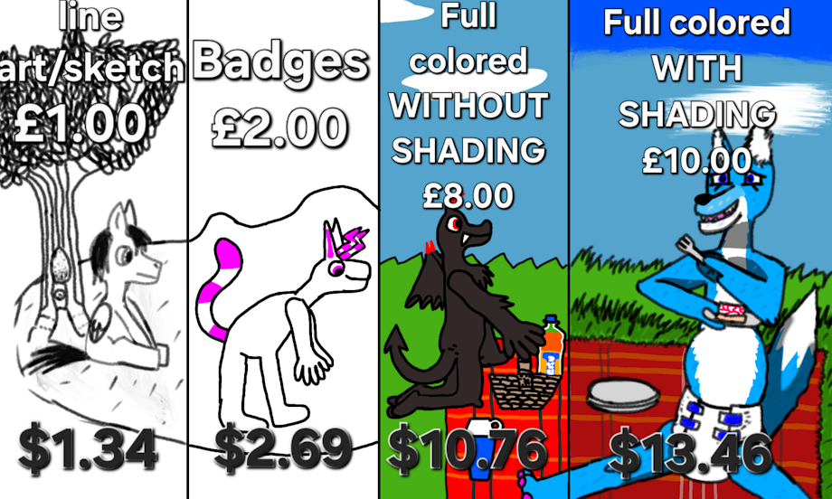 UPDATE: Since both the sketches/line drawind and badges are cheap. I WILL N๐ซT be doing the half payments!
