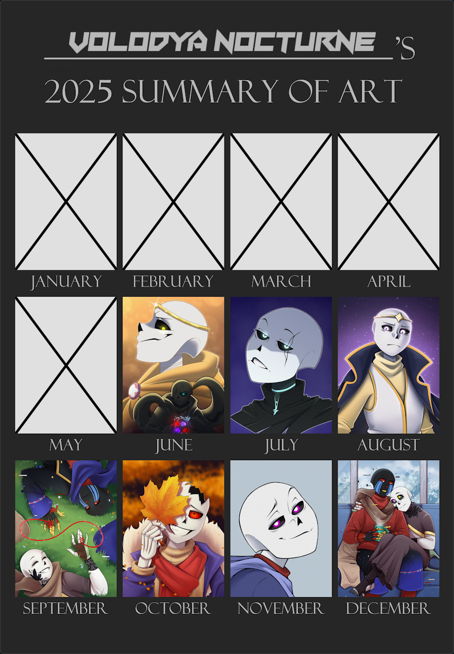 Not a huge pile of art this year - I jumped into the fandom mid-summer with zero skeleton-drawing experience! But you know what? I still love how this year turned out. In just half a year, my skeleton-drawing skills grew so much! I experimented with details, styles, and finally found what I truly enjoy.