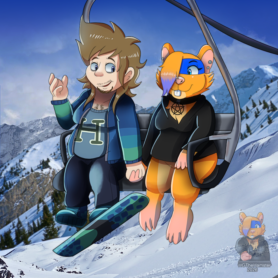 My first drawing of the year! Featuring myself and https://www.furaffinity.net/user/quaquaval character Cyrus! He's always been known as a snowboarder since he was created so I decided to start the year off by drawing him and I on a ski lift. Personally I would probably be scared to go on one of these irl. But that doesn't mean my fursona would ride on one lol.