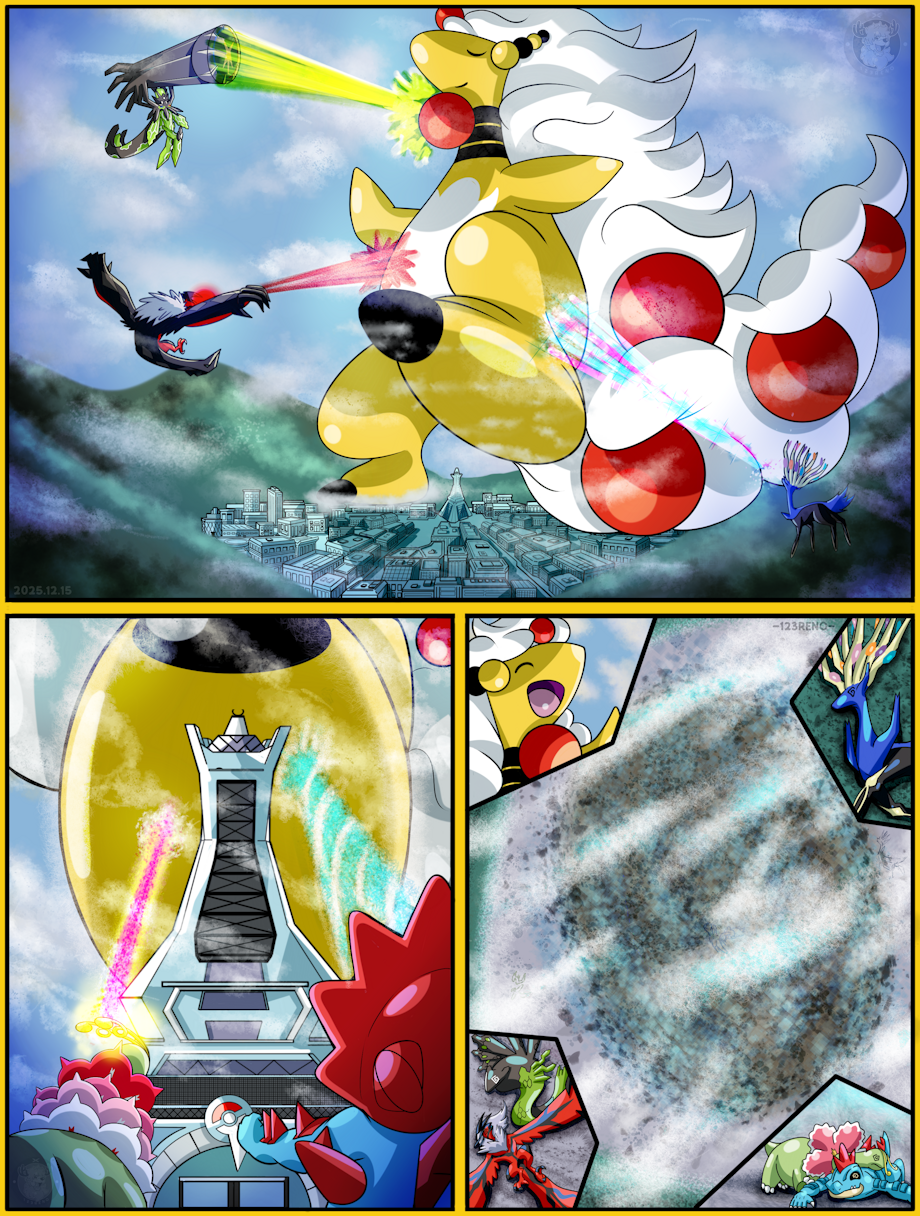 The mega sized mega ampharos: Pharea, is back! and she's stomping over lumiose city now, as various tiny legendary pokemon try to attack her! and some other mega pokemon too <w<