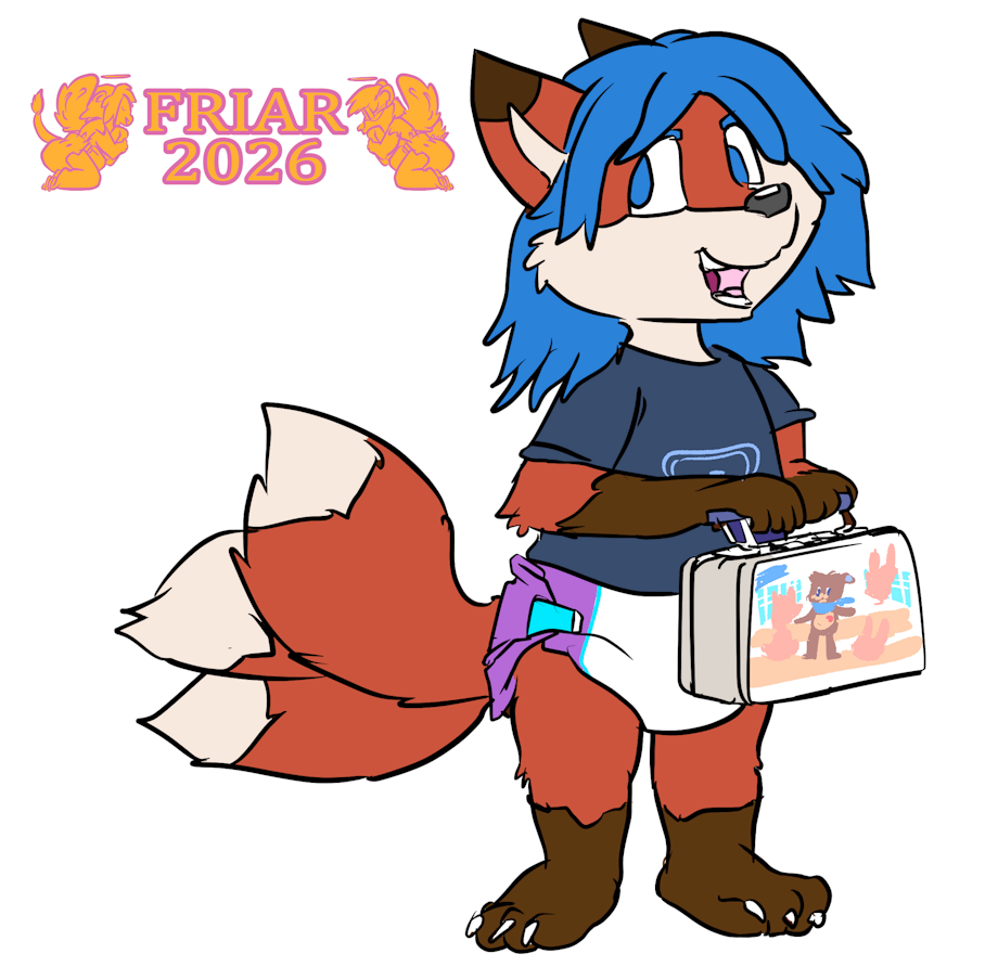 Illustration of Alfador the three tailed diapered kitsune holding a Patches lunchbox while waiting on the school bus. A Rejuvacations logo is on the wall of the school bus stop shelter.