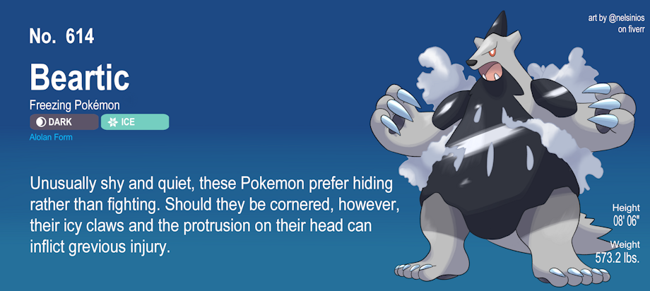 Dex Entry National #: 614 Beartic Alolan Form Dark/Ice Species: Freezing Pokemon Height: 8' 6" Weight: 573.2 lb Ability: Snow Cloak/Steadfast; Hidden Ability: Sheer Force HP 115 Attack 100 Defense 90 Sp. Atk 70 Sp. Def 80 Speed 60 Total 505 Recently discovered by a traveling Pokemon Trainer, Mt. Lanakila hides small groups of Cubchoo and Beartic. Hidden in the dark caves and tunnels of the snowy mountain, these variants are much shier and prone to fleeing from intruders. However, if cornerned, Alolan Beartic will viciously defend their families by swiping with icy claws and charging with the thick point of dark crystal on their head. Their Ice/Dark typing makes them even weaker to Fighting-Type Moves, but they are slightly more defensive. Their abilities also give them more opportunity to avoid being hit despite their bulk, giving them a fighting chance. Alolan Beartic also produce a thick, cold smoke from pores in the dark armor on their torso, which they use to create a shroud. It can disperse this smoke to confuse and freeze enemies, allowing them to get away. Alolan Beartic learn the move Throat Chop at Level 39, giving them access to a Dark-Type move shortly after evolution. If caught by a Trainer, Alolan Beartic have a much more demure temperament outside of battle. They are somewhat sensitive to sunlight, but have much better heat tolerances. Their oddly humanoid feet have a thick pad that can grip onto the smallest imperfections of ice, preventing them from slipping. |