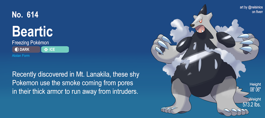 Dex Entry National #: 614 Beartic Alolan Form Dark/Ice Species: Freezing Pokemon Height: 8' 6" Weight: 573.2 lb Ability: Snow Cloak/Steadfast; Hidden Ability: Sheer Force HP 115 Attack 100 Defense 90 Sp. Atk 70 Sp. Def 80 Speed 60 Total 505 Recently discovered by a traveling Pokemon Trainer, Mt. Lanakila hides small groups of Cubchoo and Beartic. Hidden in the dark caves and tunnels of the snowy mountain, these variants are much shier and prone to fleeing from intruders. However, if cornerned, Alolan Beartic will viciously defend their families by swiping with icy claws and charging with the thick point of dark crystal on their head. Their Ice/Dark typing makes them even weaker to Fighting-Type Moves, but they are slightly more defensive. Their abilities also give them more opportunity to avoid being hit despite their bulk, giving them a fighting chance. Alolan Beartic also produce a thick, cold smoke from pores in the dark armor on their torso, which they use to create a shroud. It can disperse this smoke to confuse and freeze enemies, allowing them to get away. Alolan Beartic learn the move Throat Chop at Level 39, giving them access to a Dark-Type move shortly after evolution. If caught by a Trainer, Alolan Beartic have a much more demure temperament outside of battle. They are somewhat sensitive to sunlight, but have much better heat tolerances. Their oddly humanoid feet have a thick pad that can grip onto the smallest imperfections of ice, preventing them from slipping. |
