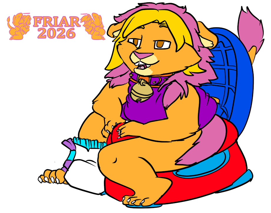 Illustration of Friar the diapered lion pooping in his training potty in the pushies school potty stall. "Huff...huff...That would've felt much better in my diaper!"