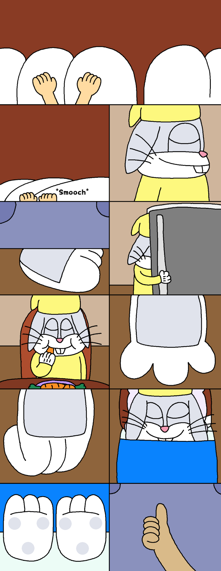 Bugs lifts his feet up and you're in between his toes as he curls them and you kiss them as well. Bugs then gets up with his eyes closed, squishing you under his sole as he proceeds to walk to the kitchen for a carrot meal while you're still under his foot. He gets to the fridge and eats a few carrots while also spreading and curling his toes. Then he goes back to bed with his feet out of the blanket. You were fine from all that stomping earlier, but you enjoyed it as you give a thumbs up to signal that you're okay.