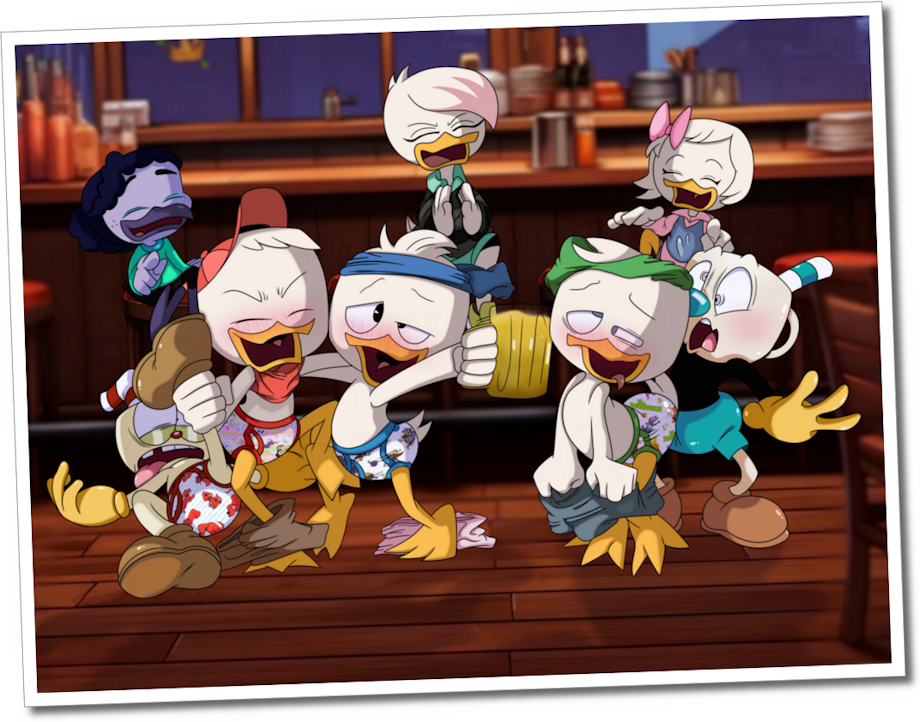 I hadn't been doing images of the DuckTales of Hearts Rp at first so I never did images for their first visit to Traverse Town. On their second visit they got up to some shenanigans though. They made friends with their former enemies, the Cup brothers. They got into a dare where the most scared gets diapered, pacified, and put to sleep. Huey won that won. They got drunk at a bar with all the girls. They even decided to take a picture together in the bathroom. Why not. Louie was in a rare silly mood that day.