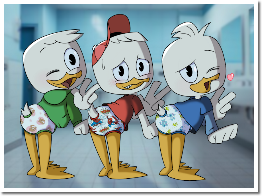 I hadn't been doing images of the DuckTales of Hearts Rp at first so I never did images for their first visit to Traverse Town. On their second visit they got up to some shenanigans though. They made friends with their former enemies, the Cup brothers. They got into a dare where the most scared gets diapered, pacified, and put to sleep. Huey won that won. They got drunk at a bar with all the girls. They even decided to take a picture together in the bathroom. Why not. Louie was in a rare silly mood that day.