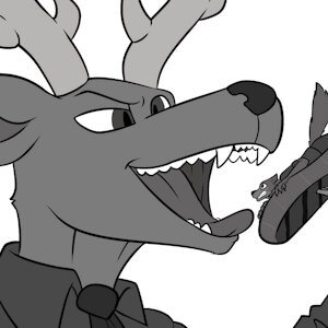 Ash yelps and sputters, trying in vain one last time to call out to him, but she can't even get a word out before she's brought to the stag's gullet, before-