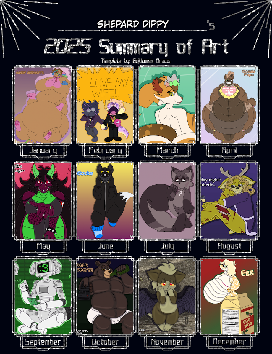 Late to the party, but she wanted to show off what she had drawn last year with some of her most popular pieces! Thank you for all the support and she hopes to give plenty of great pieces in 2026 also <3