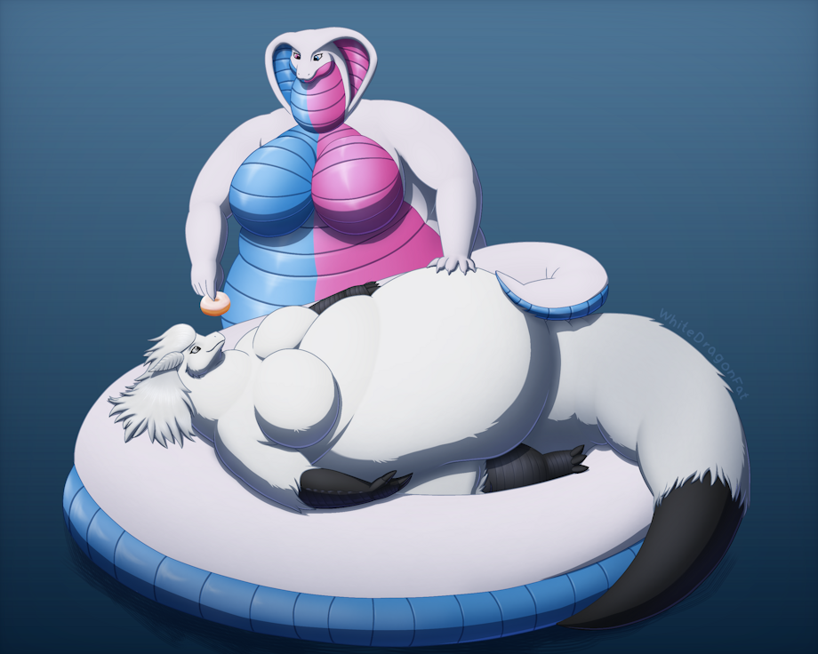 Victoire is lying contentedly on Ayla's tail, eating glazed doughnuts and sinking in as her soft, round belly grows bigger and bigger. Only she has the ability to satisfy dragons with their seemingly insatiable appetites, and both of them are enjoying this moment.