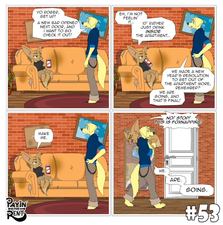 Payin’ the Rent is a slice-of-life comedy comic following the chaotic misadventures of Roger, a foul-mouthed, laid-back fennec fox, and Ben, his nerdy, optimistic Labrador roommate. The two live together in a cramped apartment where every day spirals into ridiculous situations.