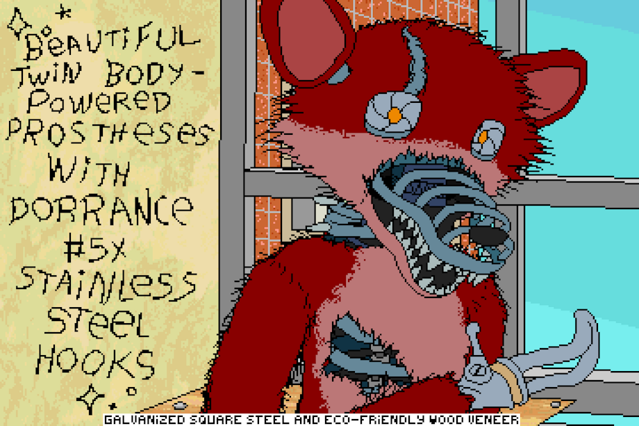 nightmare foxy is living in a 0m² space with galvanized square steel and eco friendly veneer as a real dbe amputee with beautiful twin body-powered prostheses with dorrance #5x stainless steel hooks.