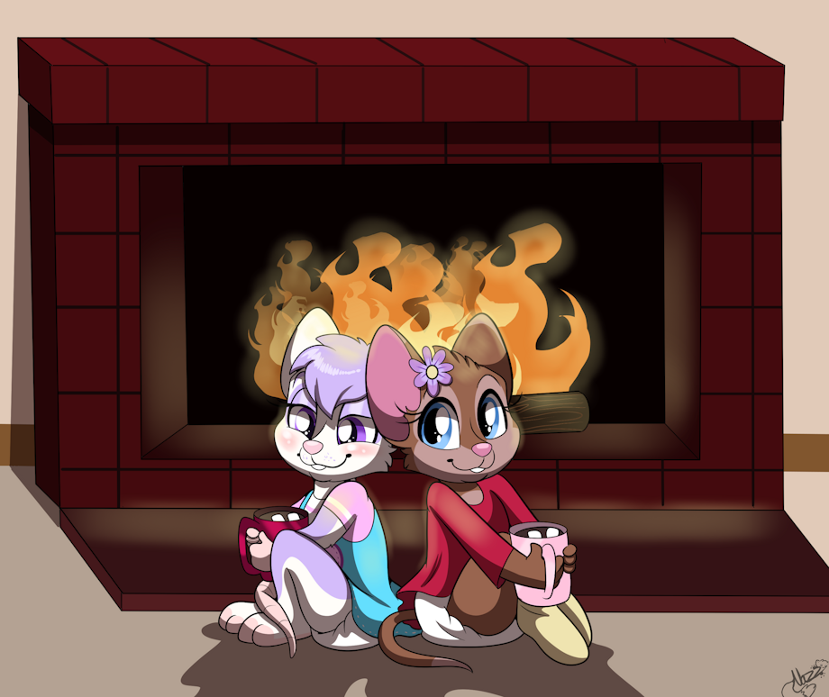 Brenda & Guiah warming up by the fireplace with hot cocoa