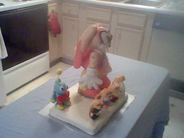 It's really the first time I ever made a cake sculpture that stands up. It wasn't easy, but I did pull it through. I also use gum paste to make the small Cream cosplay figures. It's also a first. In case you want to know the gumpaste figures, they are, in left to right, Shimigami Cream, Cheerleader Cream, Maid Cream, and Scientist Cream. Would I do it again? Umm . . . I'm not making a living with these, so I won't make too much effort on another cake sculpture.
