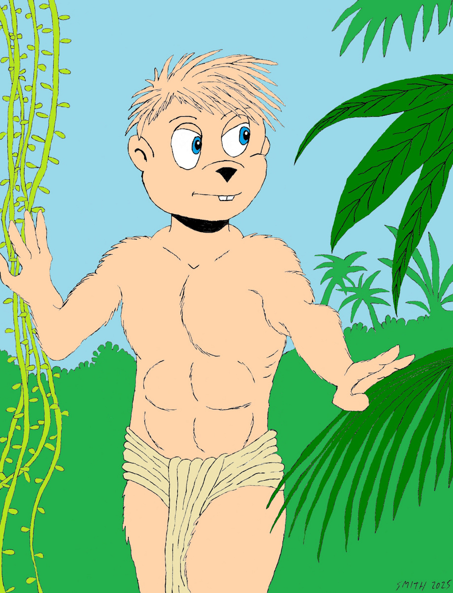 This is a picture I drew inspired by a story I wrote called Genesis in which Alvin goes back in time to 1887 and participates in the events of the H. G. Wells novel, The Island of Dr. Moreau. Since it's a tropical island and he couldn't bring any modern technology with him, he's only wearing a loincloth.