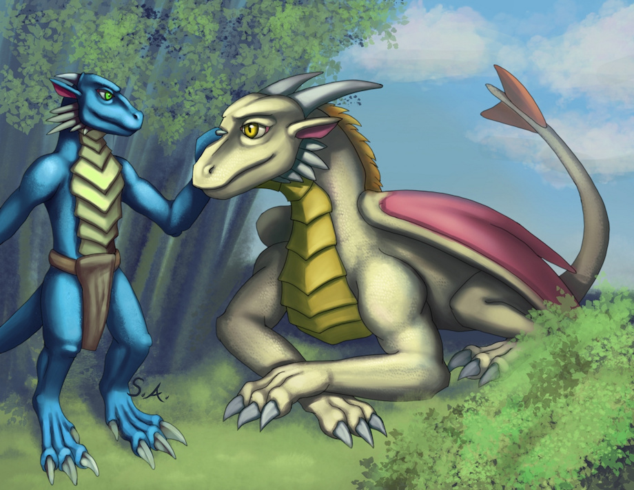 2 of the dragon creature types I like to draw meet. anthro meets feral.