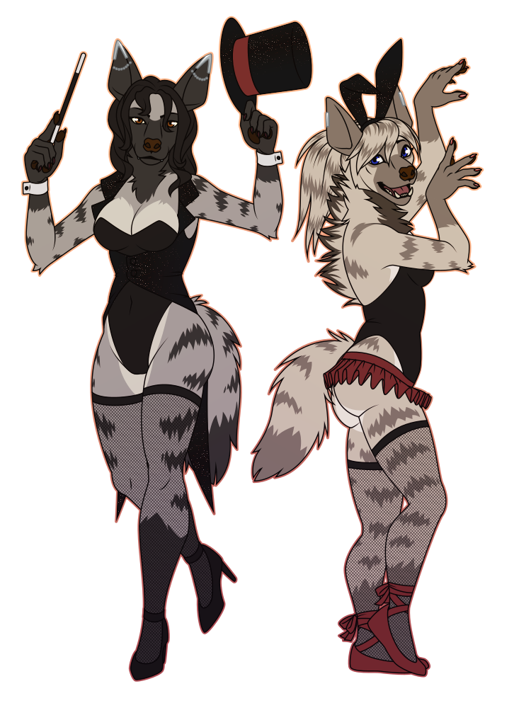 [A flat-colored illustration of two anthro striped hyena girls. One is dressed like a magician and posed with a hat and wand, and the other is striking a pose in a bunny outfit.]