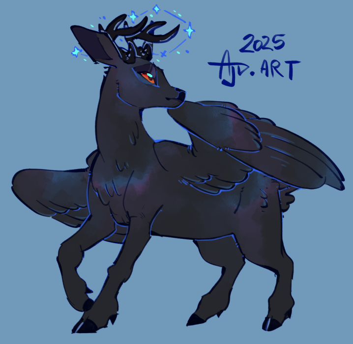 A peryton tasked with the job of guiding the stars across the sky every night. Sometimes they try to slip away so he can use his antlers to carry them back. This adopt has been sold.