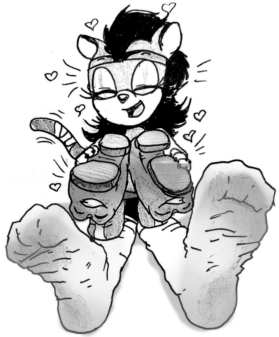 Image 1: Nancy the Panther and her magic boots. Image 2: Liea the Tigress giving herself a haircut while she has her separate hair between her toes. Image 3: Iris the Fox as a Japanese policewoman. Image 4: Imogen the Bat as an office worker with her feet on her desk. Image 5: Pamela the Badger as an Egyptian queen teasing the viewer with her feet. Image 6: Margaret the Red Panda showing her feet with candies between her toes. Image 7: Zafiro the Panther teasing the viewer with her feet.