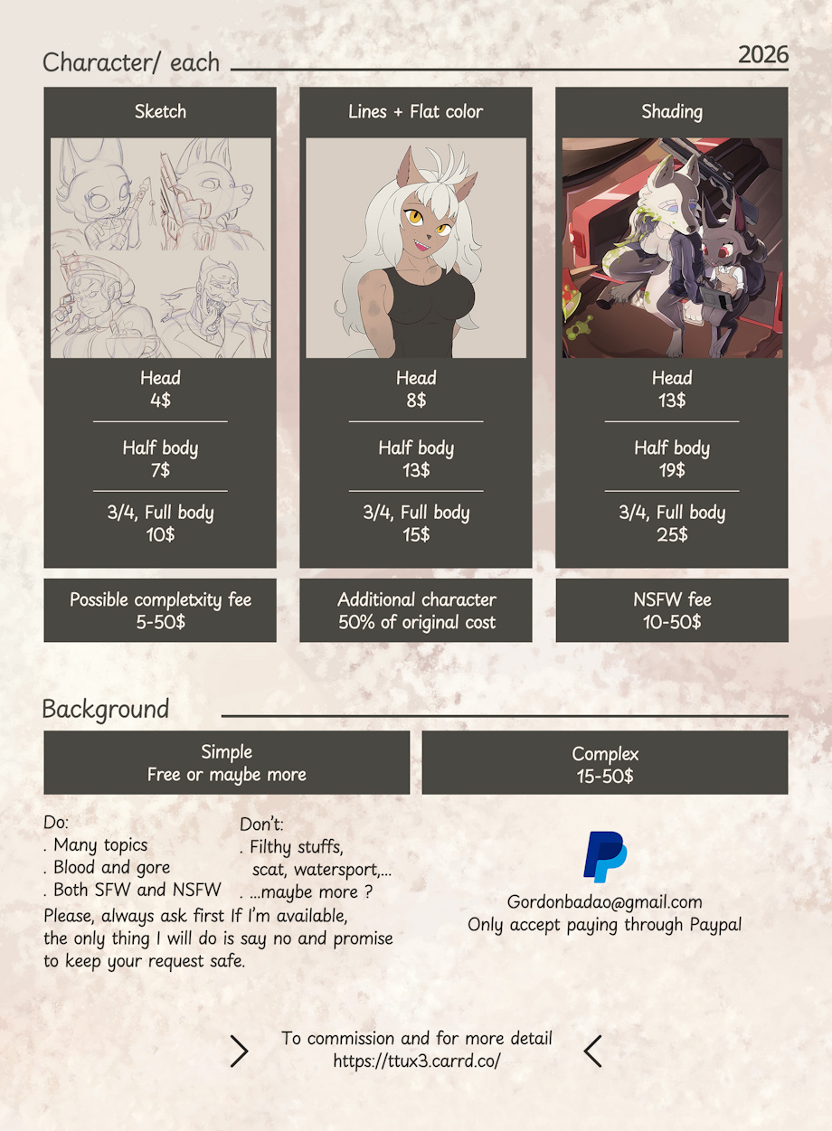 Happy new year everyone ^w^, and I'm here to let you know that I'm rising the price of my commission now, sorry QwQ. Although I'm really grateful for all of your support but due to inflation I need to raise the price of my art to keep it up, hope you understand and thank you for reading this.