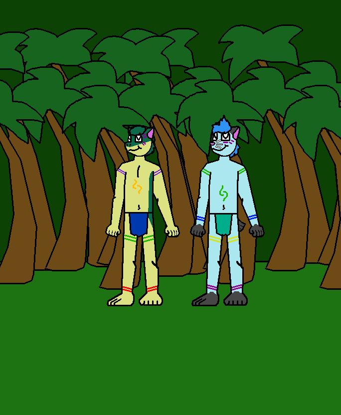 Edvin the Quilava and Bendt the Dewott (both 32 years old) are in the jungle with tribal markings on their bodies and dressed in loincloths.