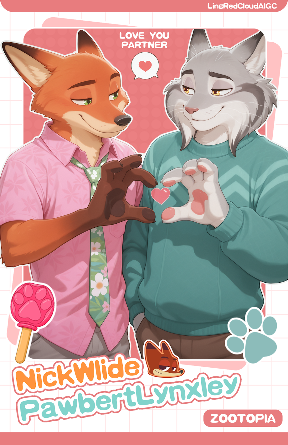 (Nick Wilde, fox boy, seductive smile, pink Hawaiian shirt, grey pants, floral tie), (Pawbert Lynxley, lynx boy, happy, Pawbert sweater, brown pants),