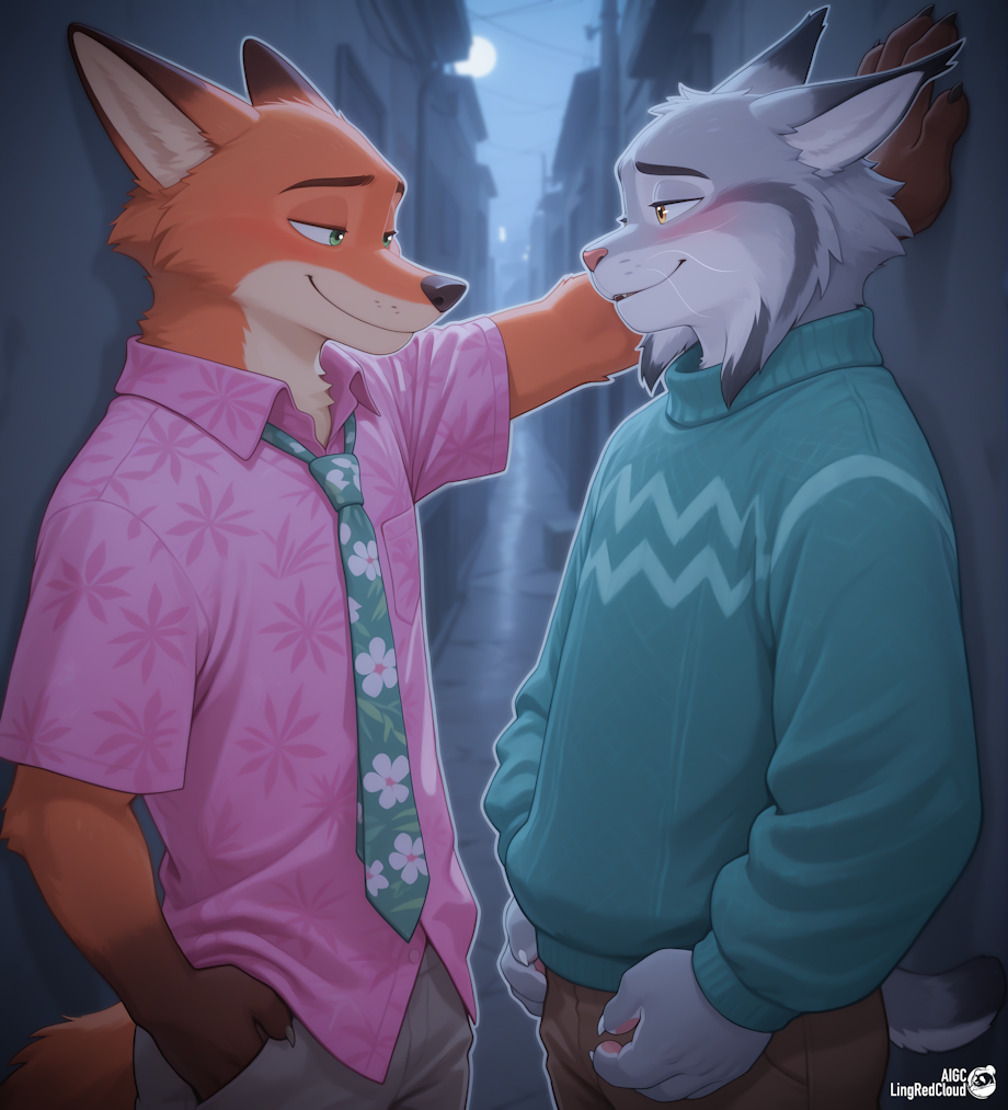 <lora:Pawbert-Nick-LoveCP-IL10-000016:0.8>,2boy,double,furry male,furry with furry,Kabedon,nick wilde,fox boy,seductive_smile,pink hawaiian shirt,grey pants,floral tie,pawbert lynxley,lynx boy,brown pants,pawbert sweater,pawpads,claws,